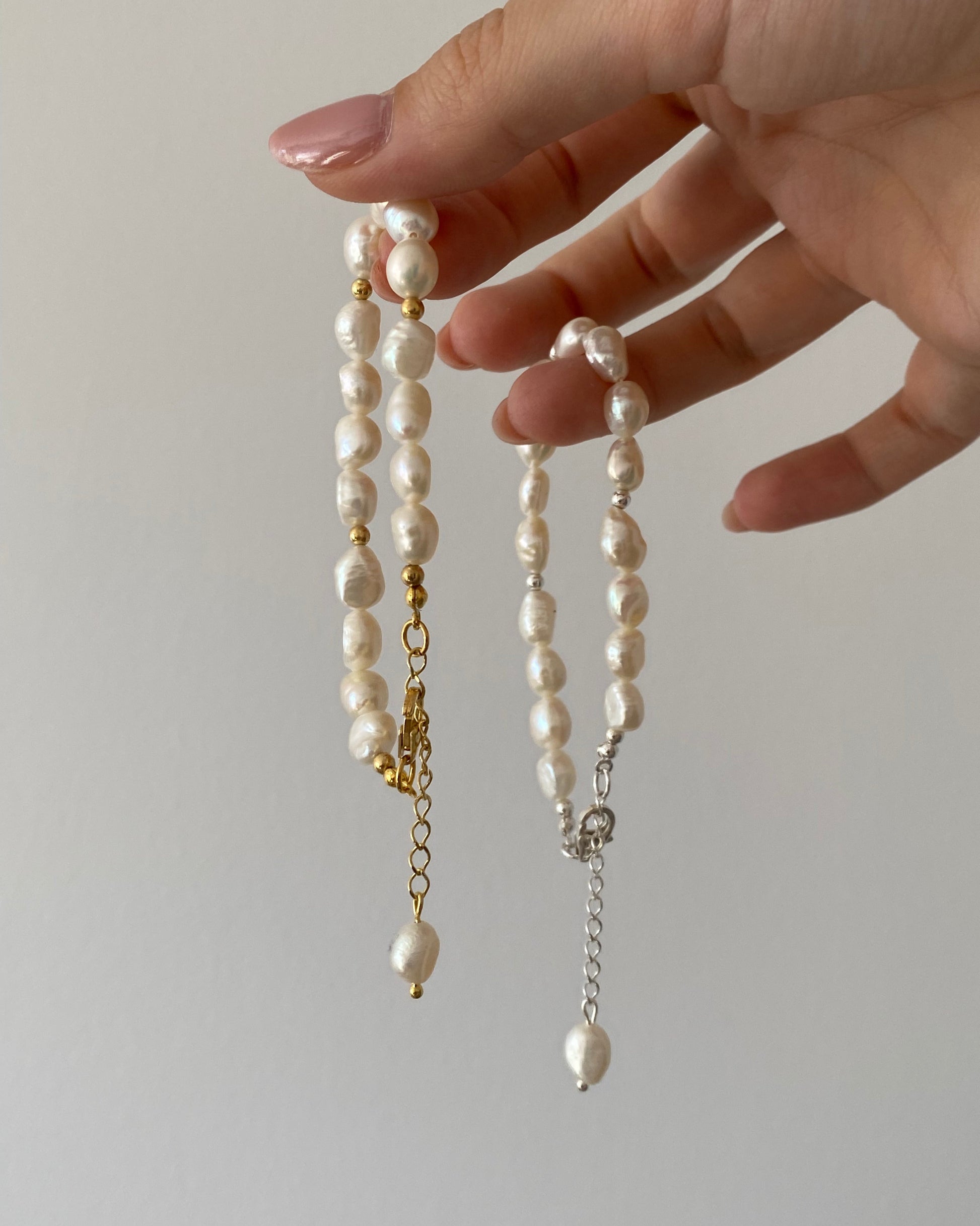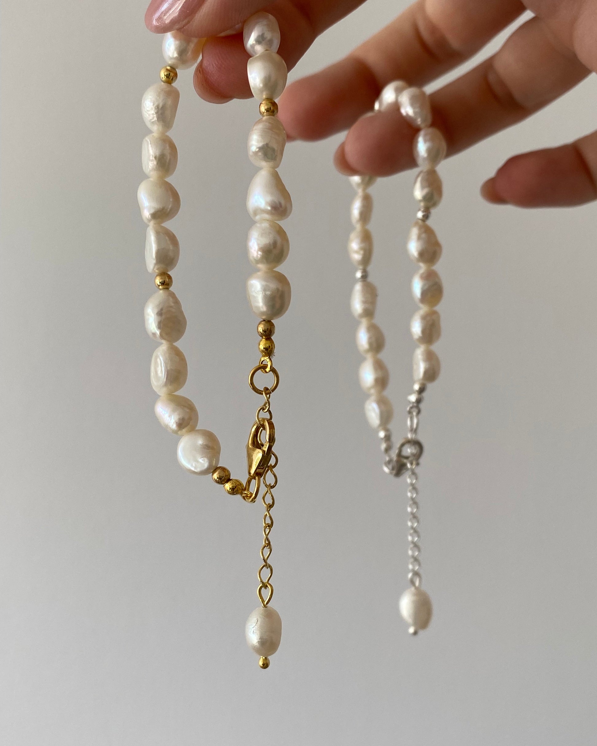 Materiał: perły słodkowodne, nić jedwabna, srebro 925, srebro pozłacane 14k