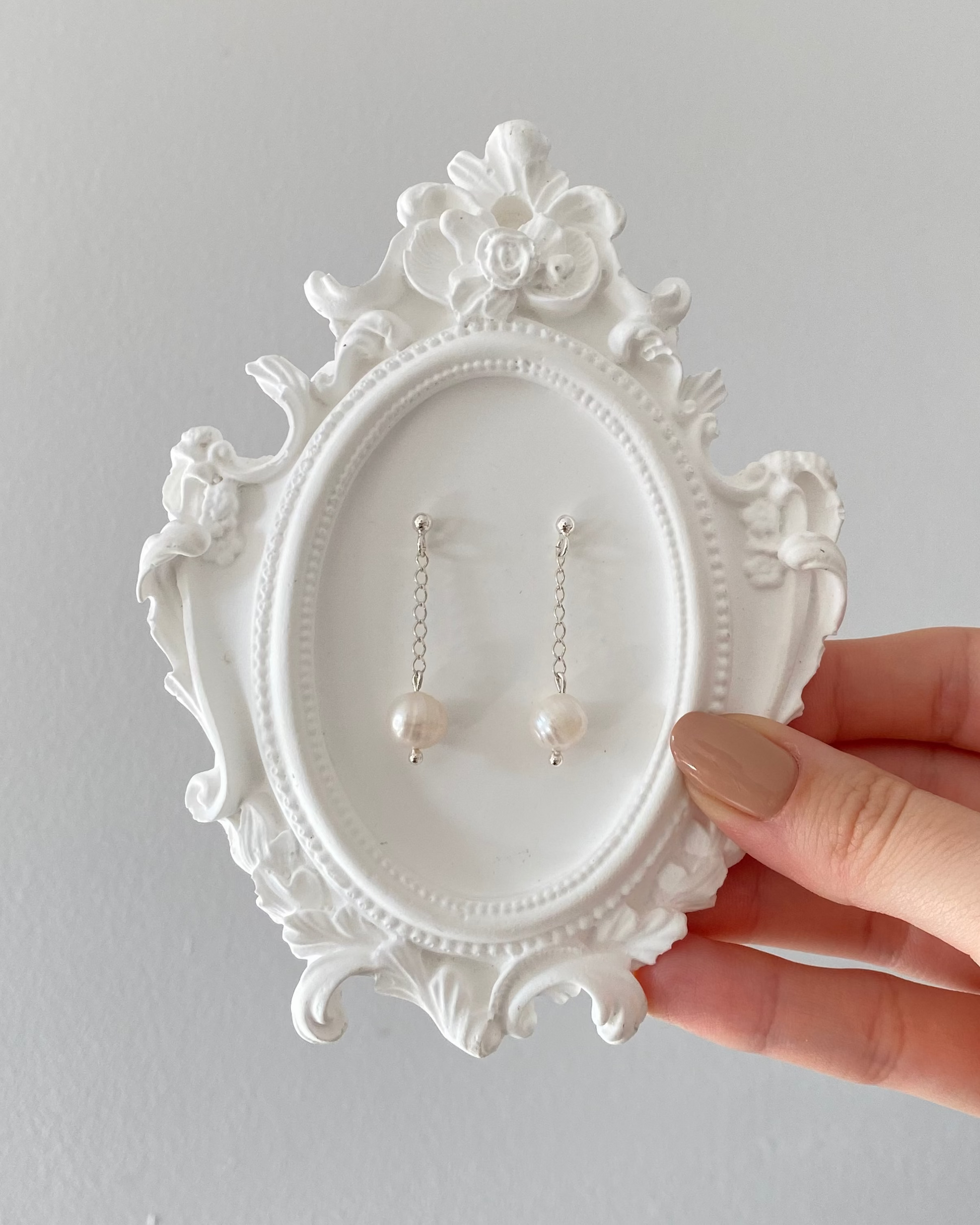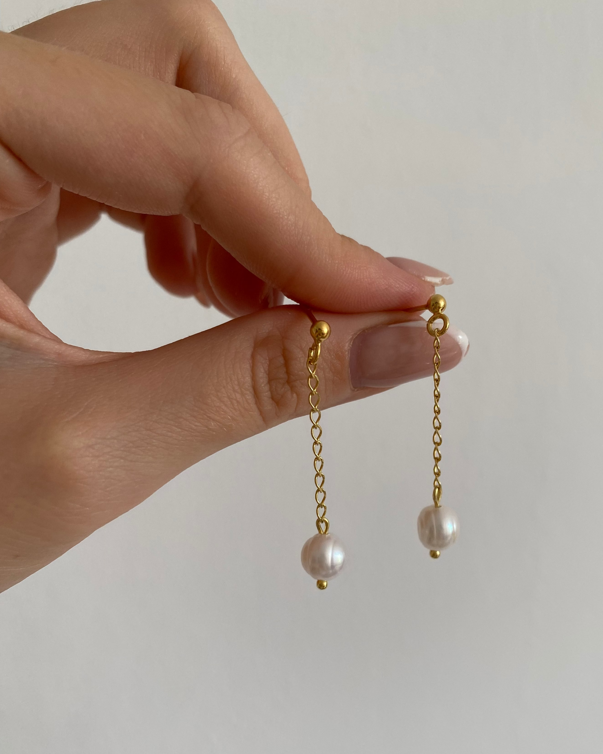 Ręcznie wykonane kolczyki z pojedynczymi perłami słodkowodnymi, podwieszonymi na łańcuszku.