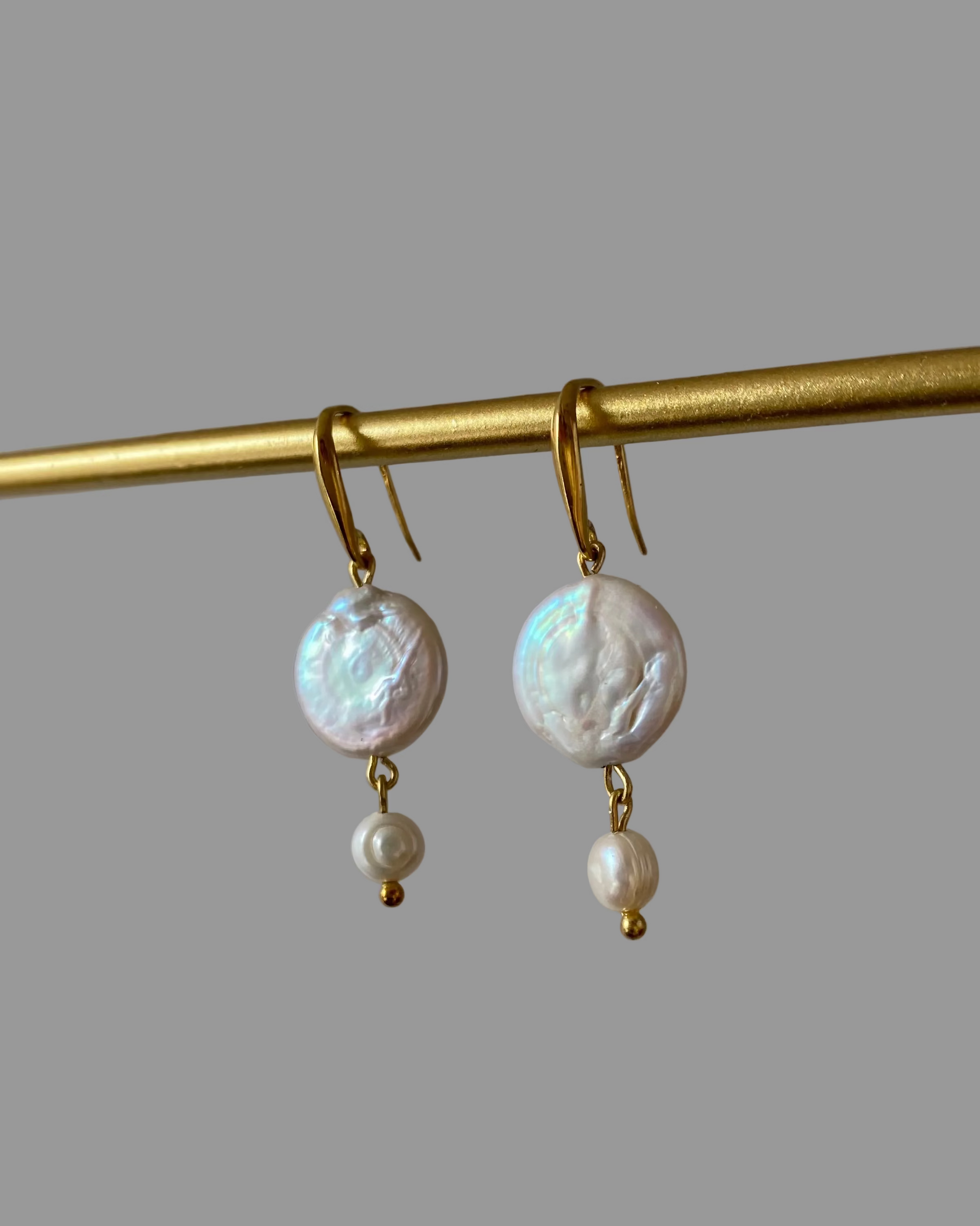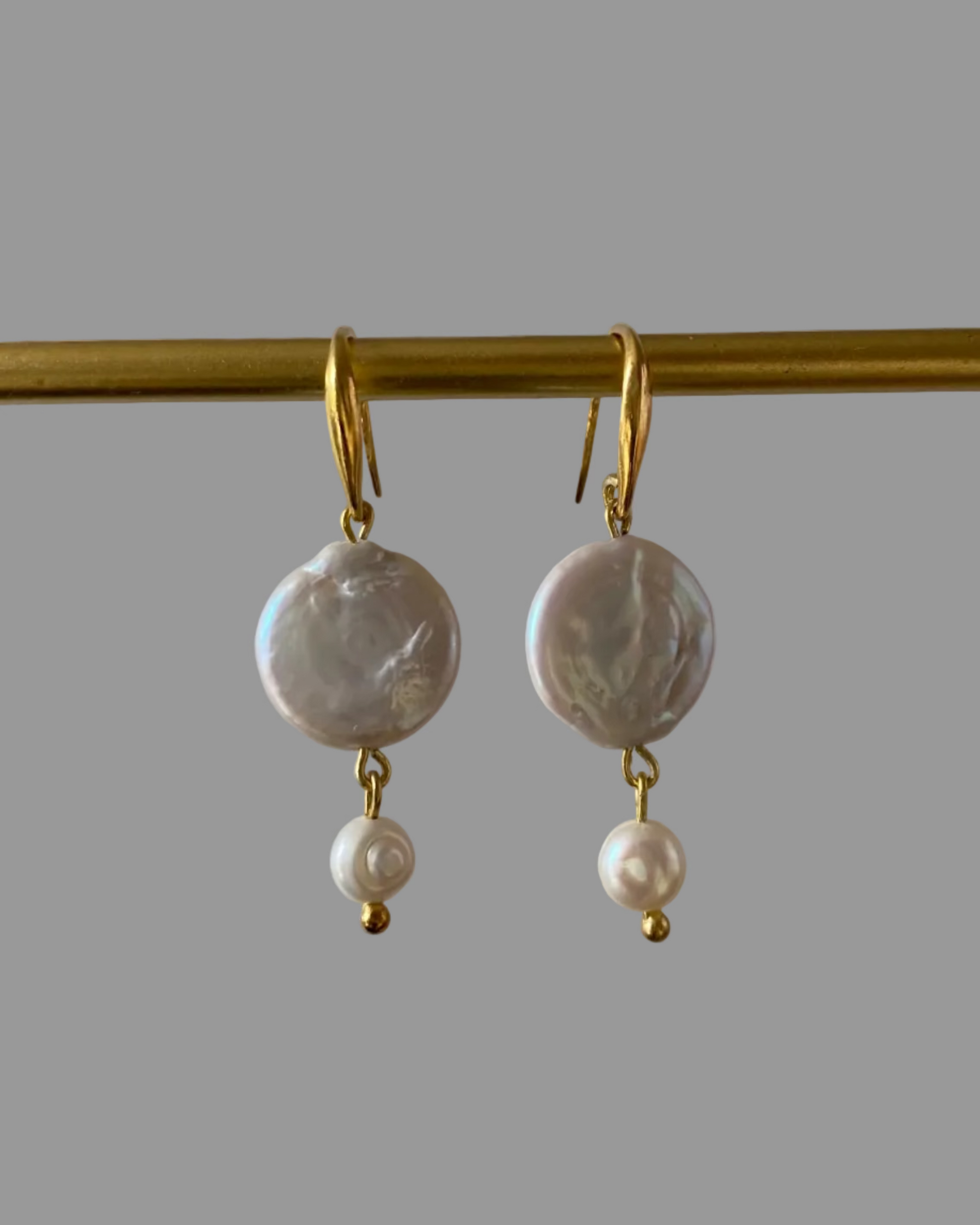 Ręcznie wykonane kolczyki z pereł słodkowodnych, w kształcie monety i guzika.