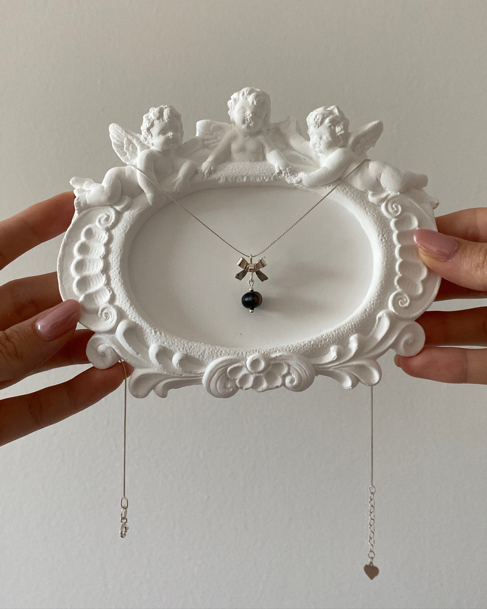 Ręcznie wykonany naszyjnik z czarną perłą słodkowodną i kokardką.