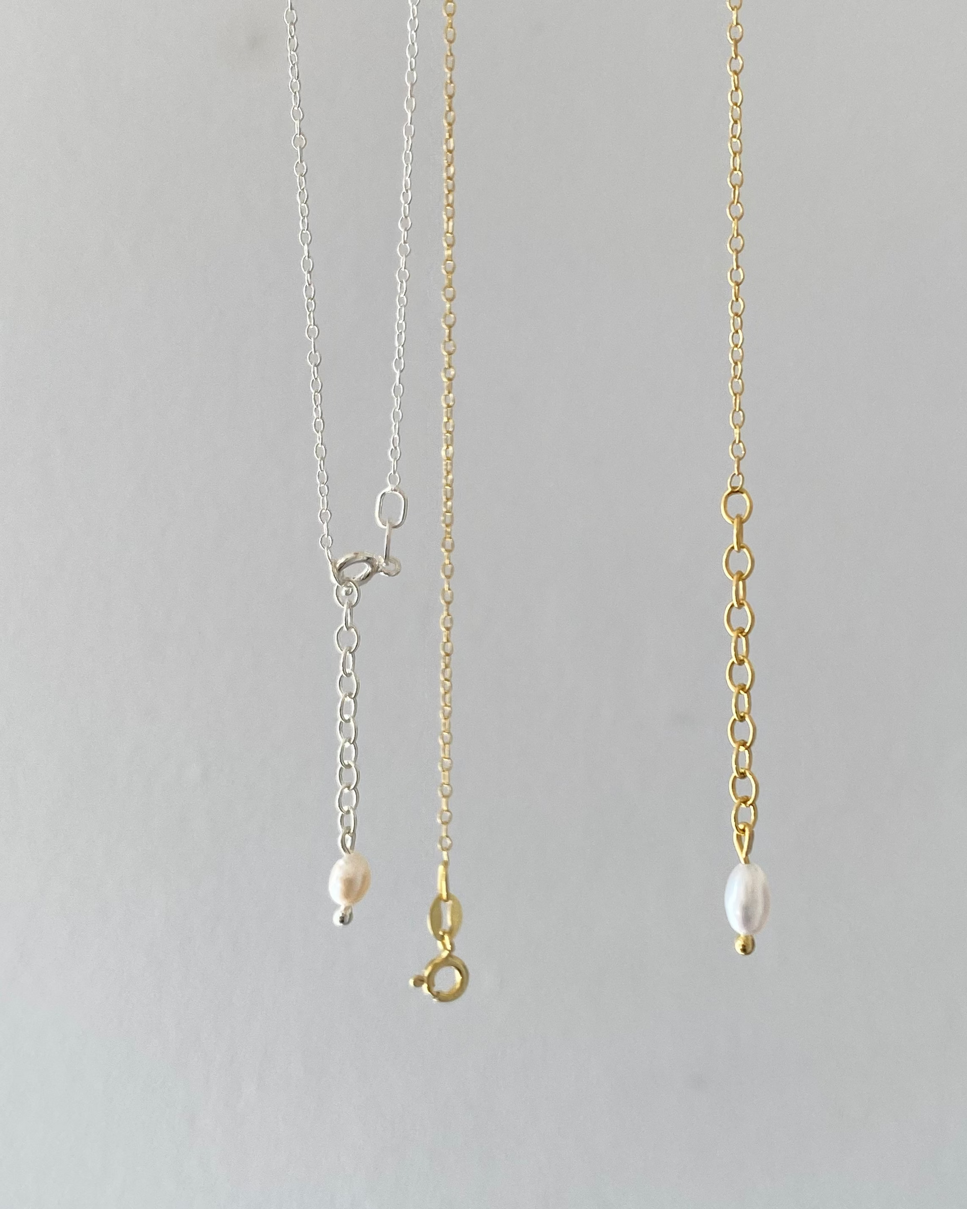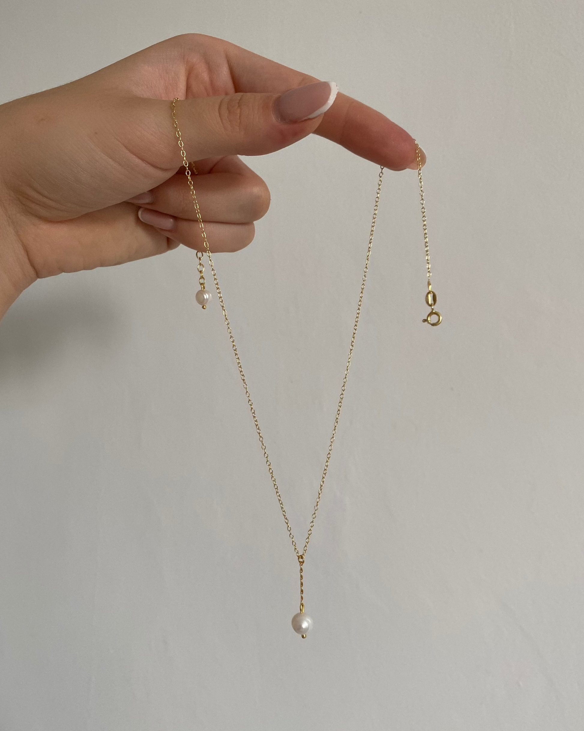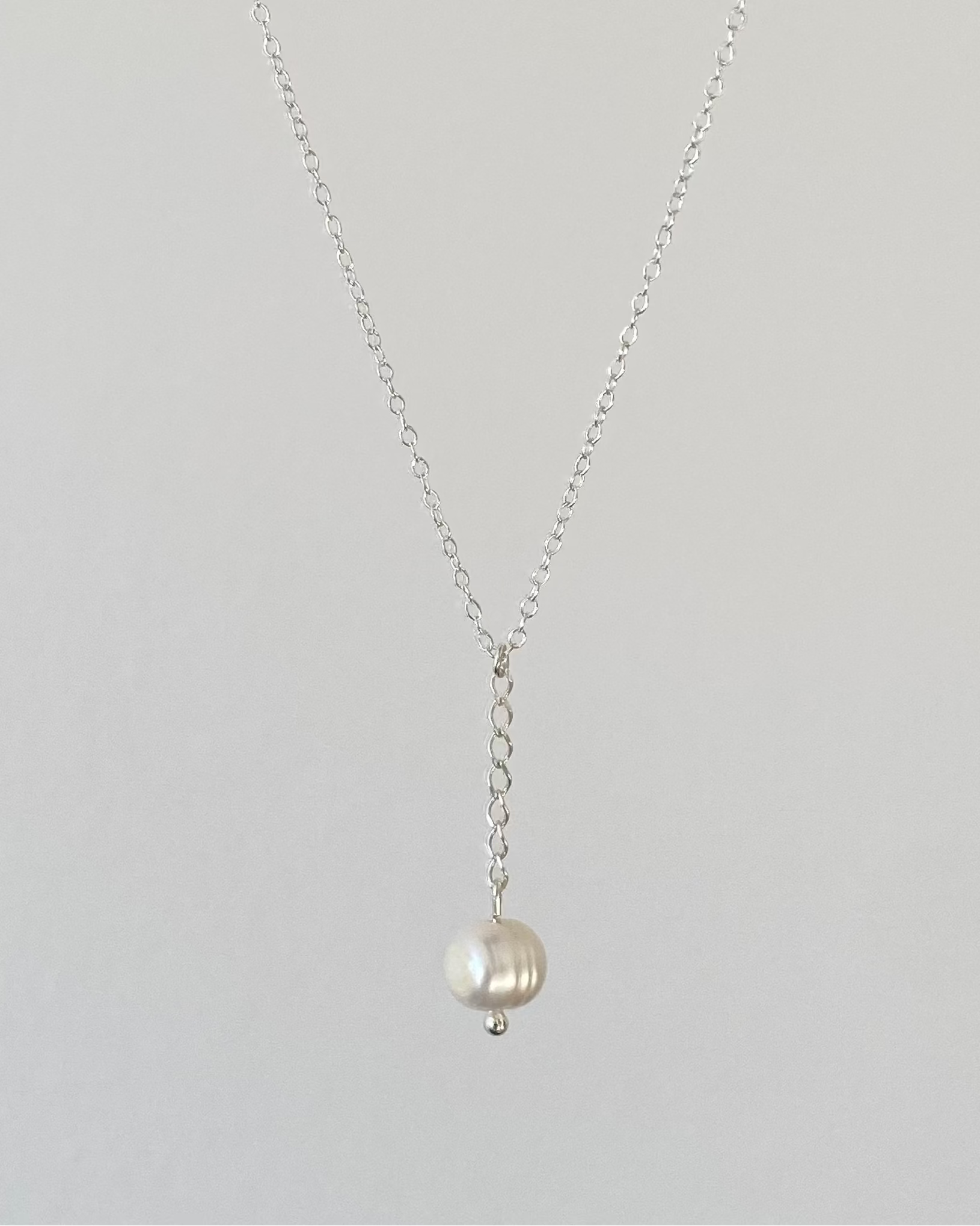 Ręcznie wykonany naszyjnik z pojedynczą perłą słodkowodną, podwieszoną na łańcuszku.