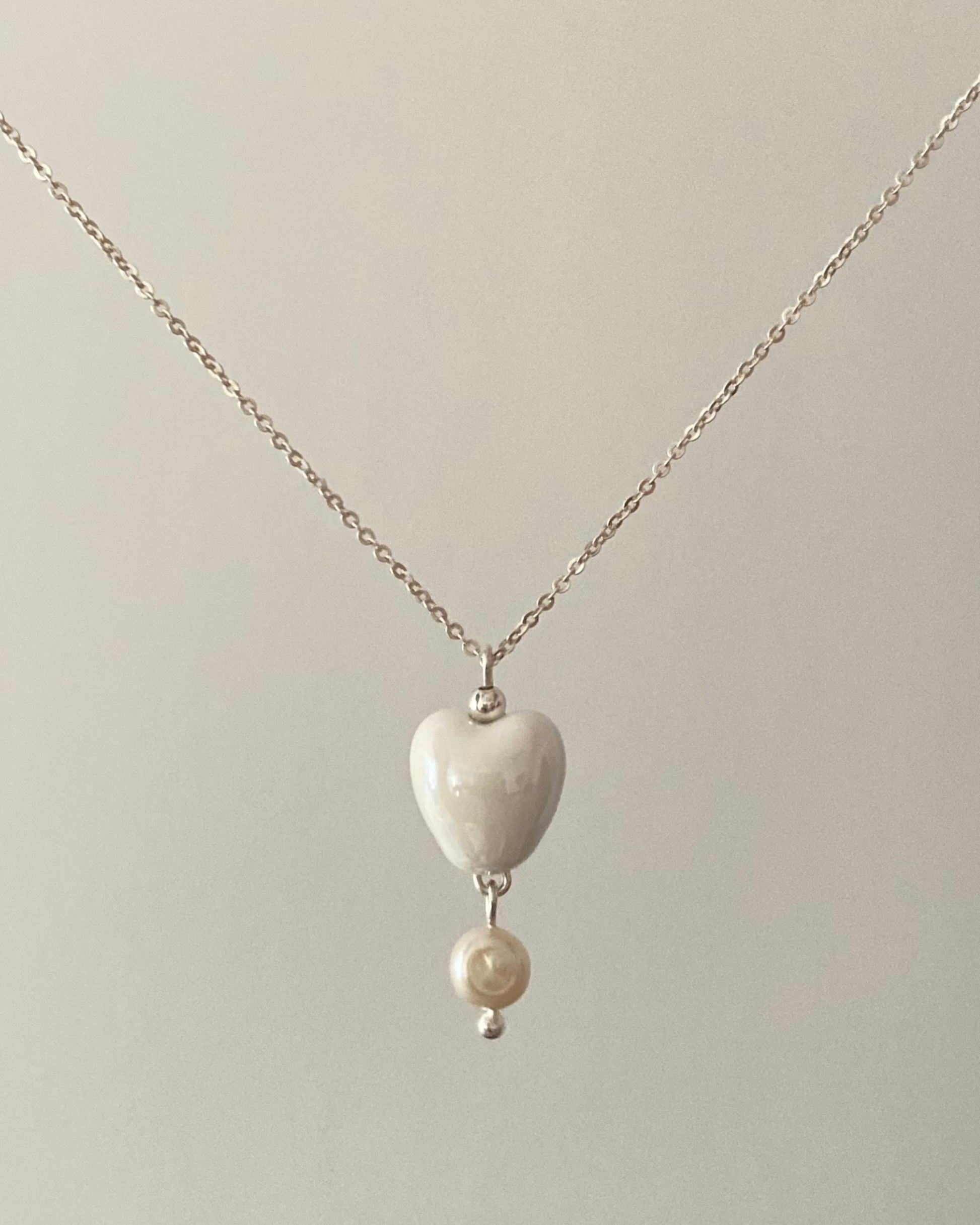 Naszyjnik z ceramiczną zawieszką w kształcie serduszka oraz perłą słodkowodną, ręcznie wykonany.